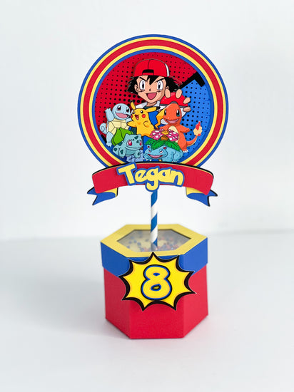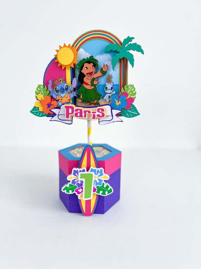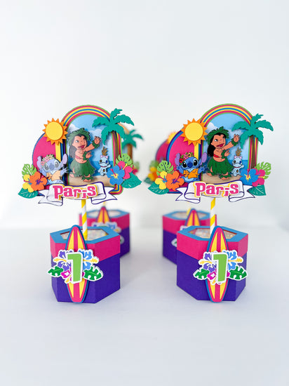 These centerpieces include a shaker piece on the top that is either filled with glitter, sequins, or foam balls that match your theme. Each centerpiece measures about 8-10inches from base to top of design (depending on design).