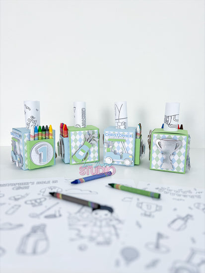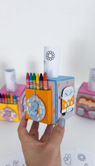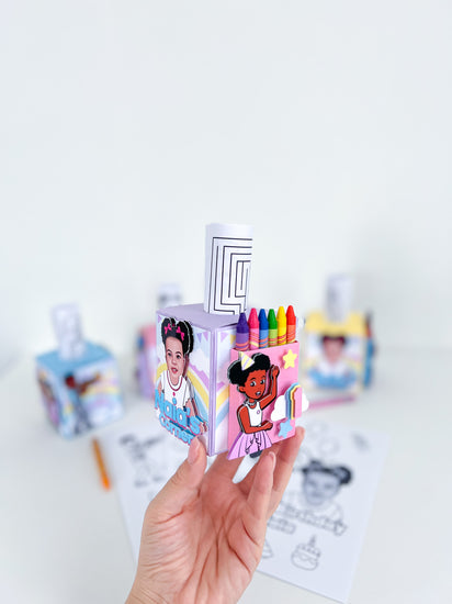 * 3 Coloring Sheets (each sheet measures 5.5x8.5in) and 6 Crayons provided per box