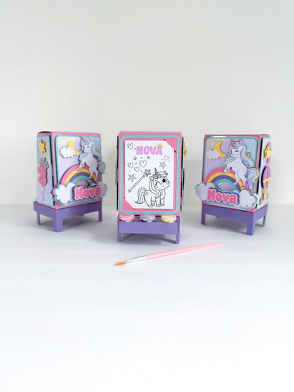 Each easel will contain 3 paint sheets, 1 brush and 3 paint colors. The inside of the easel is approximately 3.5" W x 4.7" H x 2" D and can store candies, stickers and small toys/stamps.